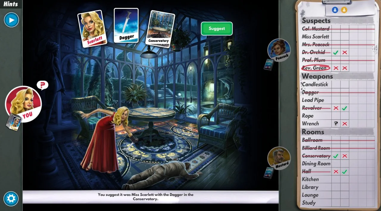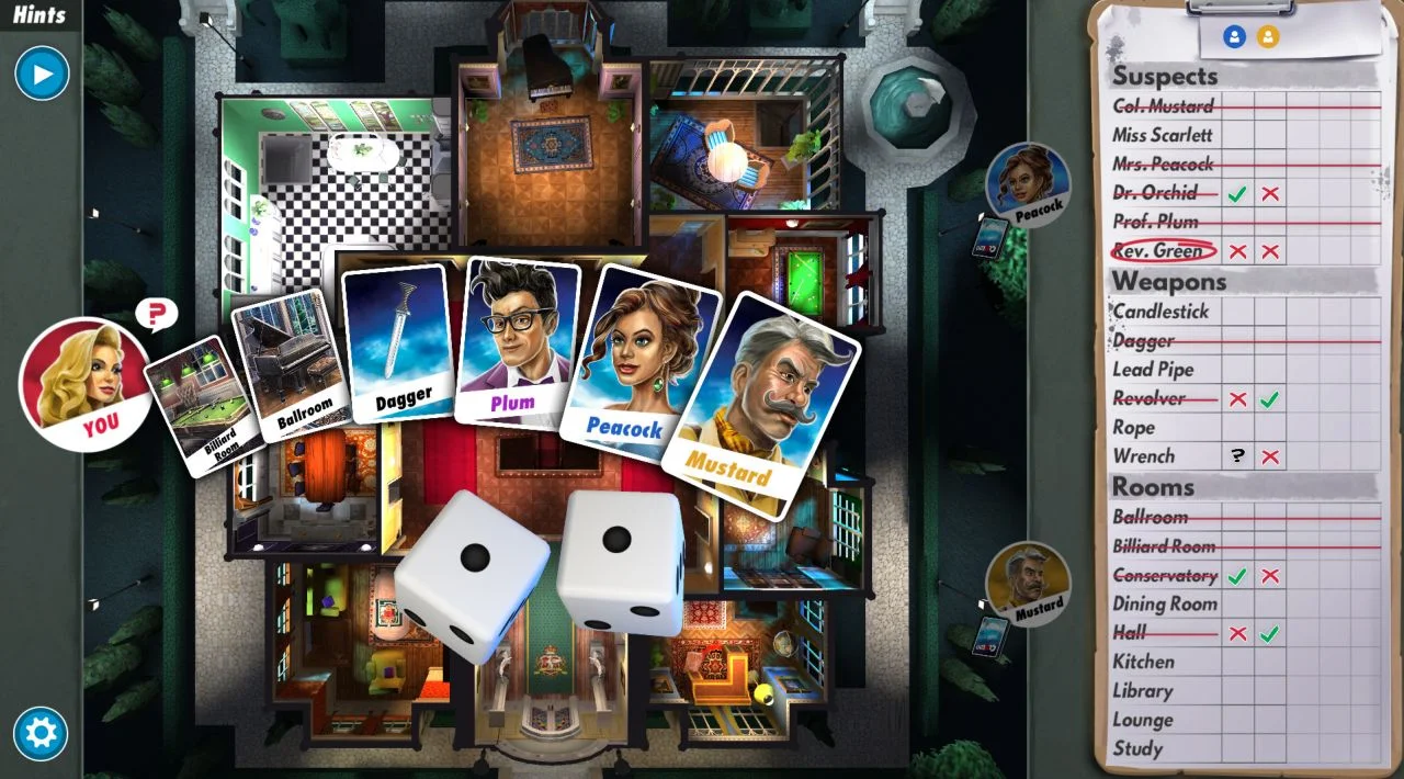 Wirtualny Cluesheet pomoże ci śledzić karty, które widziałeś. Możesz także dodać własne znaki. Obserwuj, co pytają twoi towarzysze i kto odpowiada. Czasami odpowiedzi znajdziesz bez konieczności pytania! A jeśli chcesz bardziej immersyjnego detektywa, wypróbuj Sherlock Holmes: Crimes and Punishments.