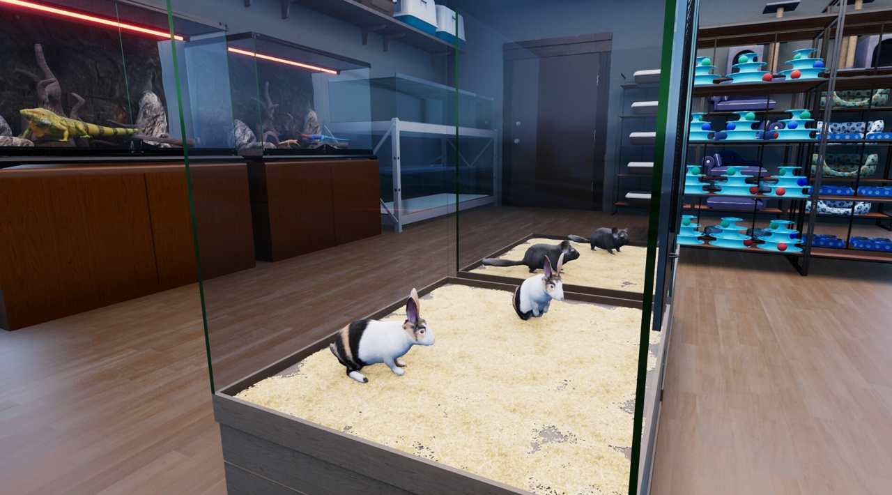 Sercem sklepu są zwierzaki. Opiekujesz się ponad 70 gatunkami - od kotów i psów po gady, ptaki i ryby. Karmisz je, sprzątasz, dbasz o przestrzeń i zapewniasz im urozmaicenie. Fajne jest to, że możesz je podnosić, trzymać, przenosić po sklepie i umieszczać w odpowiednich siedliskach. To detal, ale buduje klimat - nagle czujesz, że naprawdę „obsługujesz” sklep, a nie tylko ustawiasz menu. Podobnie jest w Animal Shelter 2.