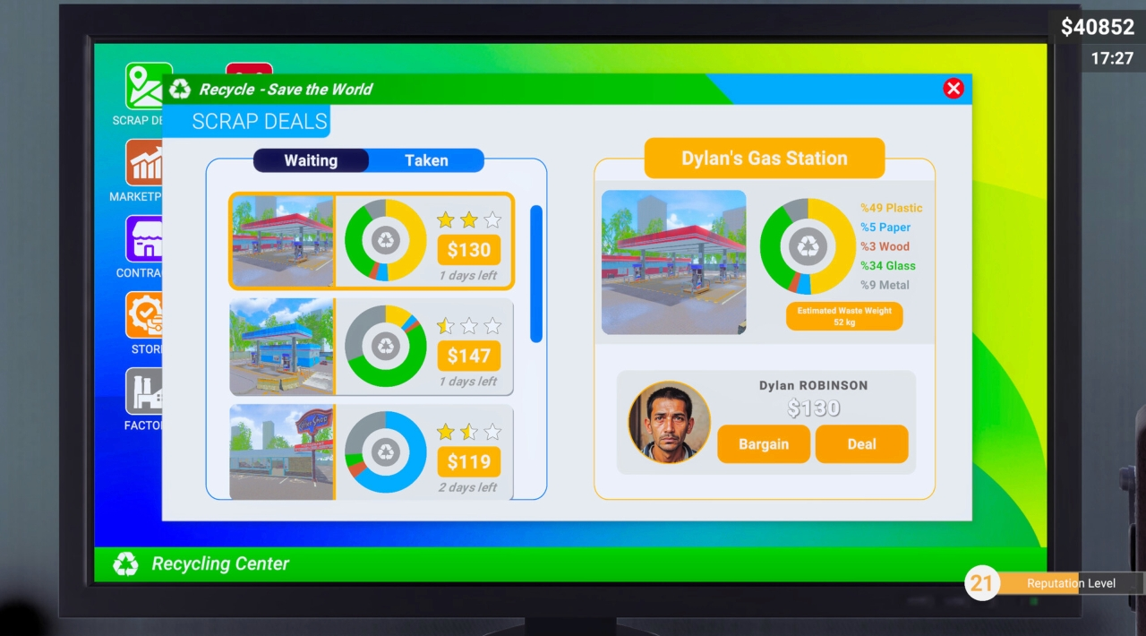 Zamiast czekać, aż surowiec sam spadnie z nieba, musisz go zdobyć. W grze robisz to także przez komputer - negocjujesz z ludźmi w mieście, którzy sprzedają swoje odpady. To ważny element, bo kupowanie taniej oznacza większy margines, gdy już przerobisz materiał na coś bardziej wartościowego. Czasem warto się potargować, czasem lepiej brać, co jest, i jechać dalej. Znasz to uczucie: „jeszcze chwilę ponawiam ofertę, może pęknie”? No właśnie.