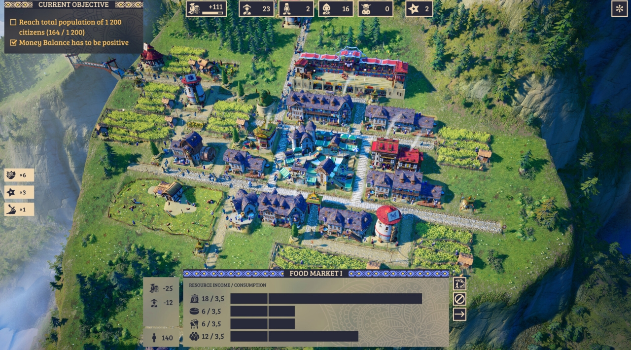 W trakcie kampanii albo w trybie sandboksowym zakładasz kilka miast na różnych górach. One współistnieją i działają jak układ naczyń połączonych - możesz tworzyć między nimi sieć wymiany i handlu, a potem wracać do już rozwiniętych osad i dostosowywać je do nowych potrzeb. Coś przestaje się spinać? Zmieniasz priorytety produkcji, przebudowujesz łańcuchy dostaw i jedziesz dalej. Jeśli lubisz takie Kingdoms and Castles z zamkami i królestwami, tutaj masz góry zamiast równin.