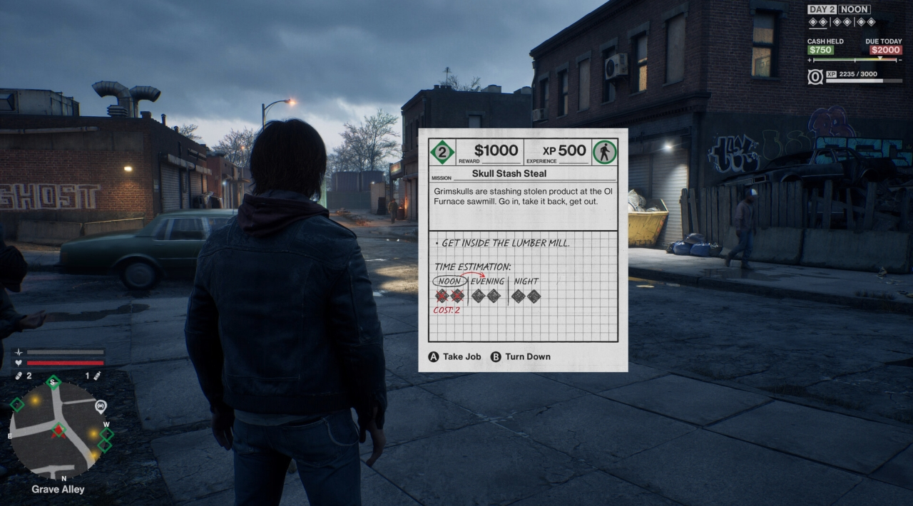 Rdzeniem rozgrywki są liniowe misje fabularne oraz zlecenia, które przyjmujesz, by spłacać zadłużenie. Nie chodzi jednak o zwykłe odhaczanie aktywności. Tutaj każda decyzja ma koszt, bo do wykonywania zadań potrzebujesz ograniczonych punktów akcji. Nie zrobisz wszystkiego. Musisz wybierać, które okazje są warte czasu, a które lepiej odpuścić. To prosty pomysł, ale daje wyraźne napięcie. Czas pracuje przeciwko tobie, a odsetki rosną z każdym dniem.