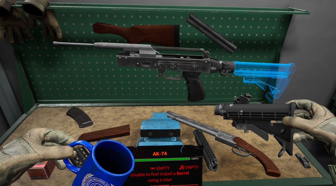Jednym z ważniejszych elementów Into the Radius 2 VR jest podejście do uzbrojenia. Broń ma zróżnicowaną obsługę, własne mocne i słabe strony oraz szerokie możliwości modyfikacji. Możesz dopasowywać dodatki, takie jak optyka, kolby, magazynki czy inne elementy, żeby lepiej pasowały do twojego stylu gry.